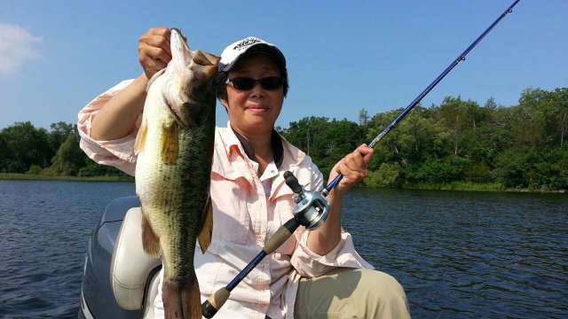 直到有一天,Eva依旧陪着闺蜜一起钓,可是运气不佳的Eva一天也没钓着几条太阳鱼,一气之下就挂了一整条大蚯蚓丢了出去,鱼漂顺势一闷,Eva一提杆子,一条3磅多的大口順即跳水,这把Eva给兴奋的,哪里钓到过如此大的家伙,顺利的溜鱼上船后,这鱼、这手感,让Eva彻底的迷上了钓鱼。