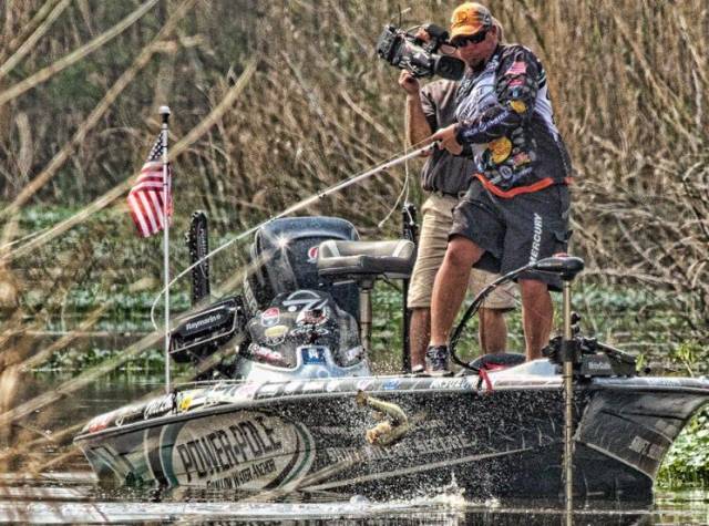 他介绍说,在其他清水的湖里,你能清楚看到在窝里的鱼把饵叼起来然后快速游出并吐到窝外。所以Set Hook的时机比较容易掌握。但是,这里的水非常浑浊,只有几英寸的能见度,所以要非常留意手上的感觉,要能感觉到什么时候鱼把饵叼起来了,并开始向窝外游动了,饵是不是叼牢了,要完全是凭感觉来选择什么时候要Set Hook。他说这个区域经受着很大的压力,这两天每天都有5、6个钓手轮番轰炸。不知道明天还能不能钓到够尺寸的(鱼身长至少14英寸)称重鱼,需要选择去别的钓点。老将Shaw Grigsby也是主要Flipping and Pitching 一种模仿小龙虾形状的软塑料饵。