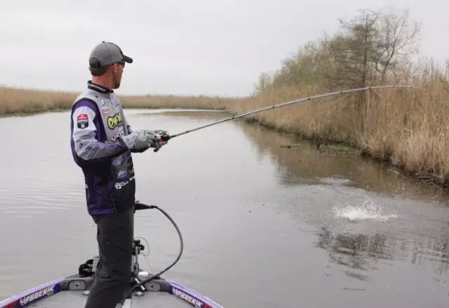 他向记者透露,很高兴他能继续领先,和第一天一样他所钓到鱼的区域是非常浅水的,只有2尺甚至更浅。目标主要是找正在要产卵的。这个区域并不神秘,有5、6个其他钓手也在这里。他认为中午12点到1点的时候有一段涨潮,这个是大鱼开口的关键时段,他是在这个时候换掉了早上时候钓到的较小的称重鱼。Chris主要是Flipping一种像是小龙虾的塑料软饵。