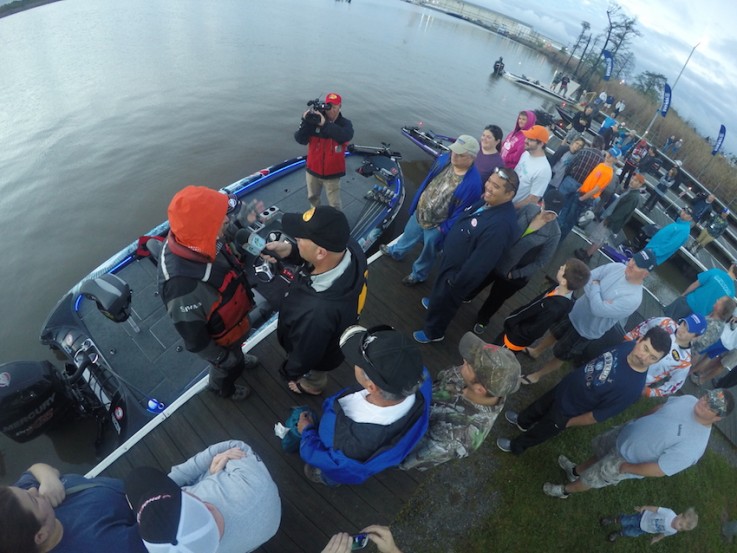 图为第四天决战前12位职业钓手轮番接受采访。至于谁能赢得2015年鲈鱼大师精英赛第一站的冠军,将会在几个小时揭晓。请读华钓在线的追击报道。