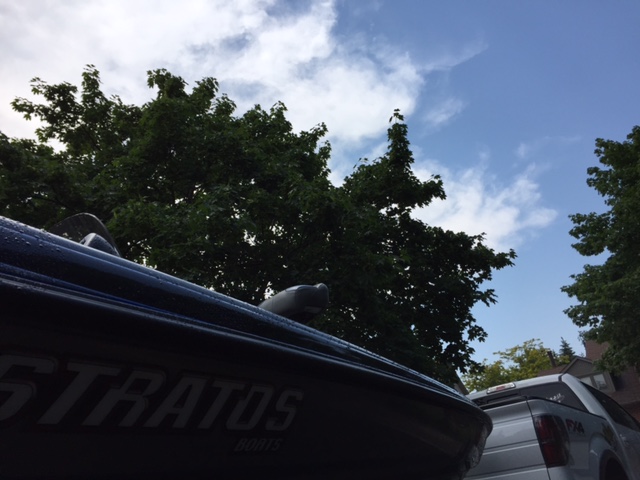 此时,北边乌云密布,总不靠谱的天预报终于靠谱了一把。刚过Bowmanville就雷雨交加了,暴雨顺便还帮我免费清洗了一下没来得及收起来的渔竿。12点半到家,雨就停了。1点钟收完船,天就放睛了。