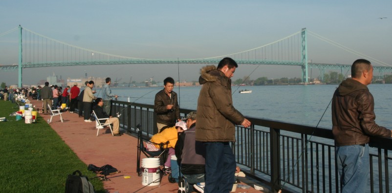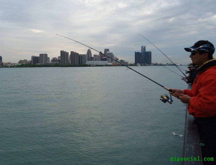 长周末钓白鱼的地方就在温莎市中心的河边,河岸有许多停车场。河道边是温莎和平纪念公园,是当地人散步休闲的地方。河的对岸是美国汽车城底特律市中心,周末的夜晚可以听到露天音乐会的震耳摇滚乐。底特律河道里经常可以看到巨型运送粮食和铁矿石的轮船通过。想想看,长周末去温莎踏青钓鱼,就是坐在河边看风景也是一个不错地选择。