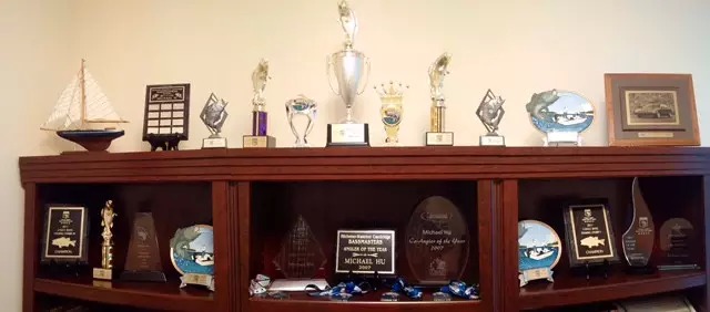 【华钓在线】(作者:王过)在投身路亚比赛10几年后,Michael Hu的书柜中所摆放的几十个奖杯、奖牌,记录着一个狂热猎鲈爱好者的路亚成就--2007年KWC Bassmasters of Canada的年度最佳钓手(AOY),2007年The Canadian Bass Angler Federation(CBAF)的年度最佳搭档(CAOY),加华渔友会2009年、2010年和2011年连续三年的年度最佳钓手(AOY),这五个沉甸甸的奖杯,无疑是对Michael Hu猎钓生涯最好的肯定和褒奖。