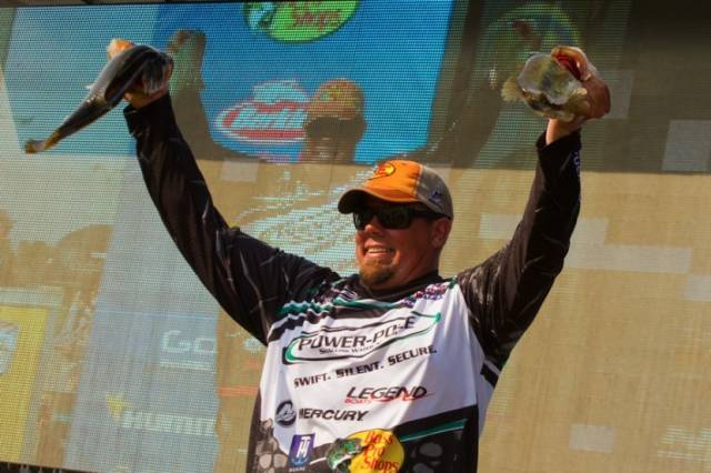 第二名:和Chris Lane同钓一个区域的还有2次AOY(最佳钓手)的得主Aaron Martens,他今天也是在那片小河道里收获了5条重12磅整的称重鱼,两天总重为25-14。