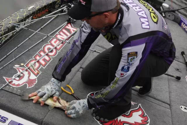 他向记者透露,很高兴他能继续领先,和第一天一样他所钓到鱼的区域是非常浅水的,只有2尺甚至更浅。目标主要是找正在要产卵的。这个区域并不神秘,有5、6个其他钓手也在这里。他认为中午12点到1点的时候有一段涨潮,这个是大鱼开口的关键时段,他是在这个时候换掉了早上时候钓到的较小的称重鱼。Chris主要是Flipping一种像是小龙虾的塑料软饵。