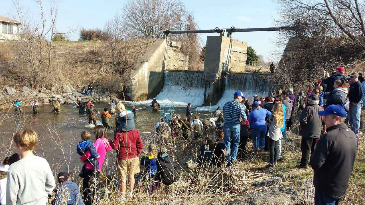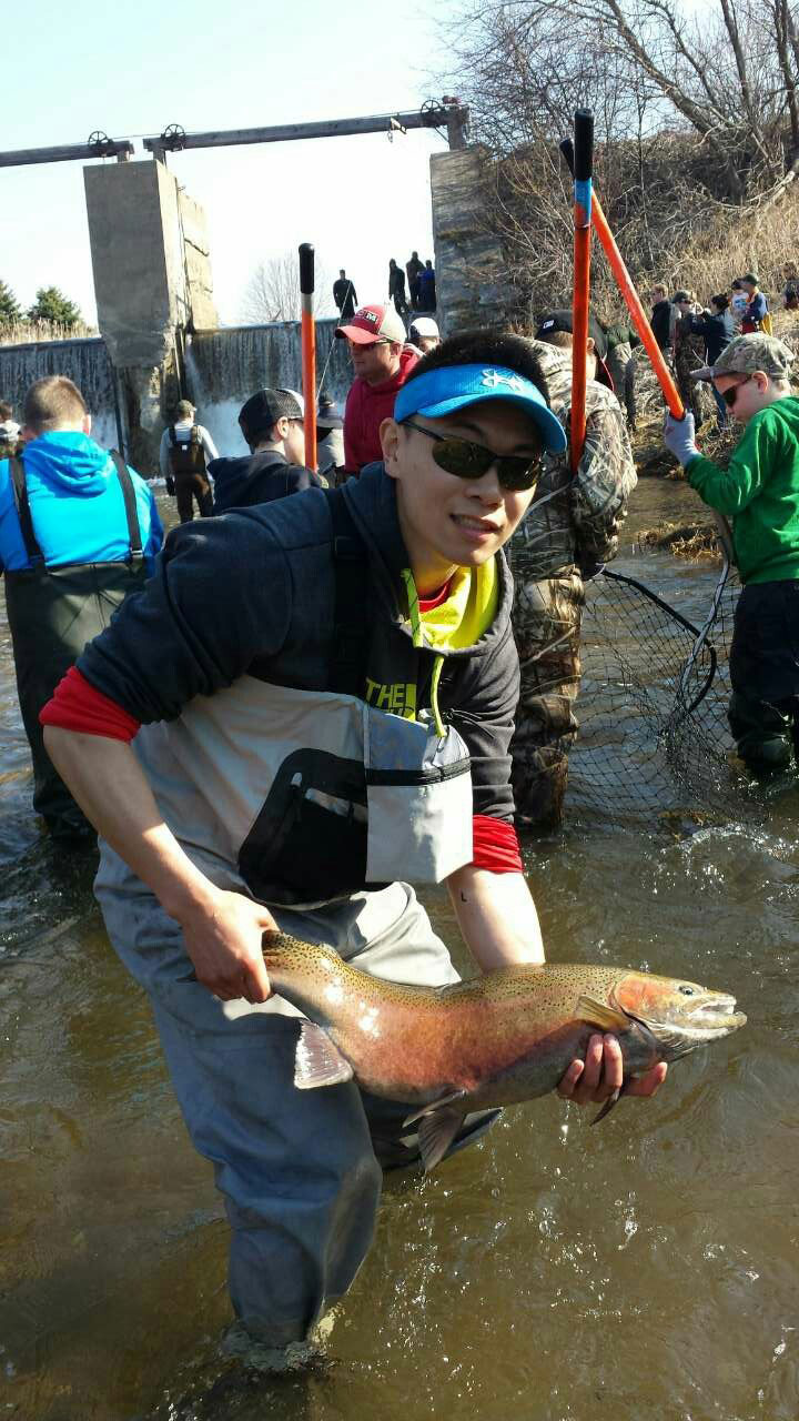 4月是每年安省南部彩虹鳟(rainbow、steelehead trout)回游,大湖中游向河道上游产卵的季节。此时大大小小的河道中都可以找到彩虹鳟。这些彩虹需要穿越各种复杂的地形达到他们的目的地,包括跳跃河坝。不像有些河坝专门这有安省政府建造的fish ladder(鱼梯)帮助鳟鱼和回流的鱼类跳跃,Pratt’s Pond的河坝高低差别较大,不具备设置鱼梯的条件。因此每年当地和来自各地的民众都聚集到此,出于公益和保护安省自然资源的初衷,帮助彩虹鳟游到河坝上游,完成产卵,延续后代。而绝大部分的待产鱼会聚集在河上游的Baltimore。
