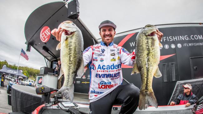 经过一天的较量,来自印第安纳州的年轻钓手,获得2012 FLW Cup冠军的Jacob Wheeler, 他今天以15-14排在第一位。