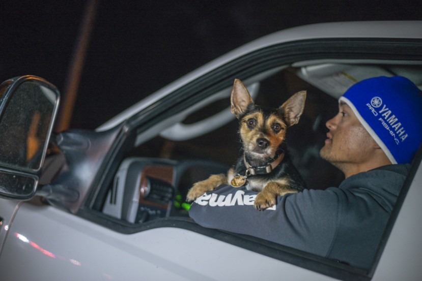 在第一天比赛中钓获30磅的加州钓手Chris Zaldain抱着爱犬等待下船。