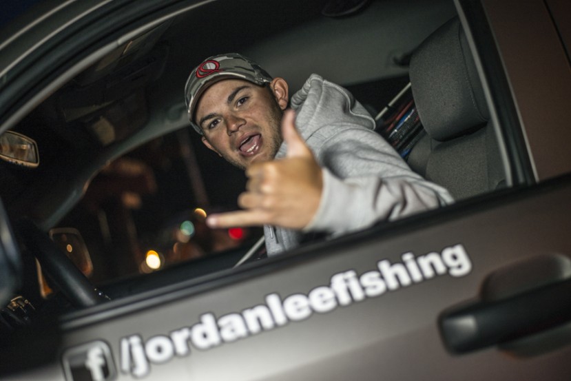 年轻钓手Jordan Lee一边下船一边打出手势。