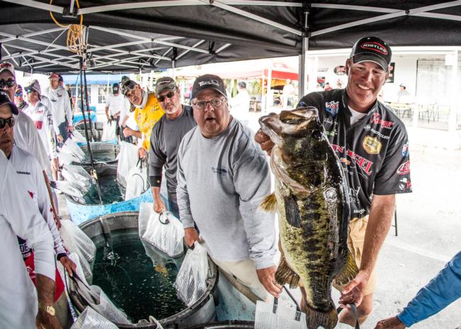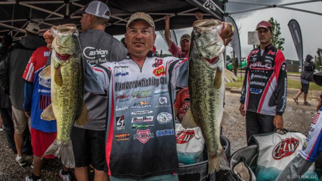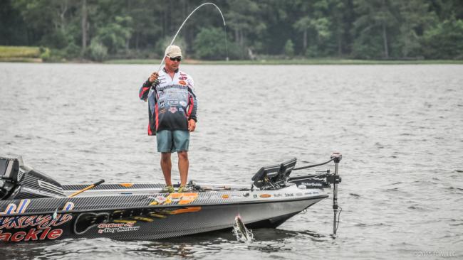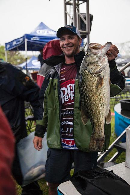 第一天领先的本地钓手Clent Davis,今天一早就钓满了五条鱼但是尺寸偏小,幸亏他又收获了一条接近6磅的大鱼,今天成绩15-12,两天38-5磅滑落到了第二位。