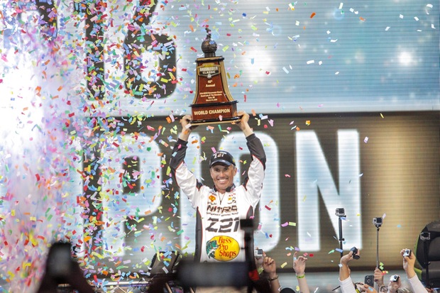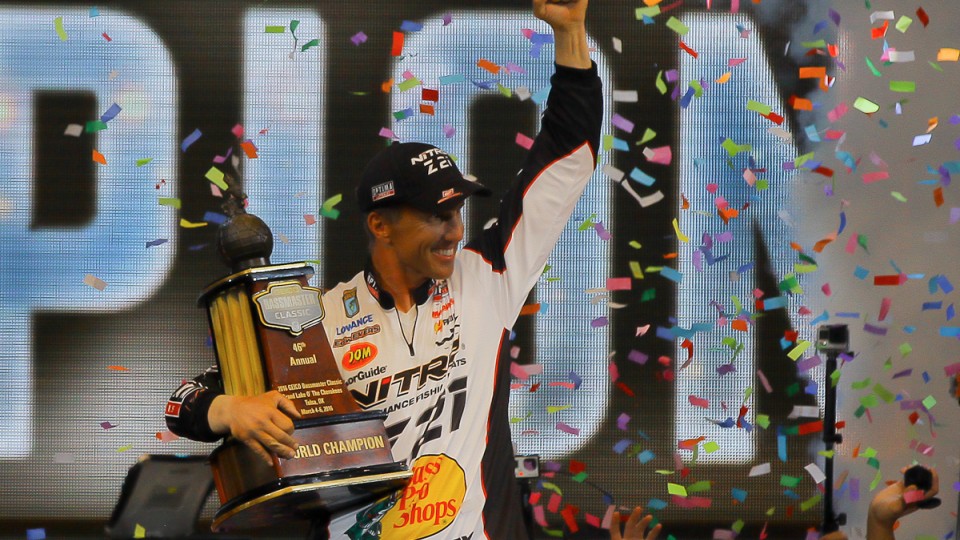 【华钓在线】记者千山报道/3月6日晚,经典赛决赛日的终极决战终见分晓,凭借最后一天的爆钓和29磅重大鱼袋,俄克拉荷马州钓手Edwin Evers终于在父老乡亲面前,击败另一位领跑两天的最被看好的当地钓手、同时也他的同室好友Jason Christie,捧起了第46届鲈鱼大师经典赛冠军奖杯。