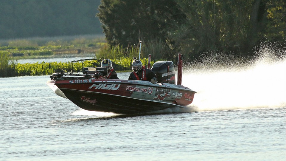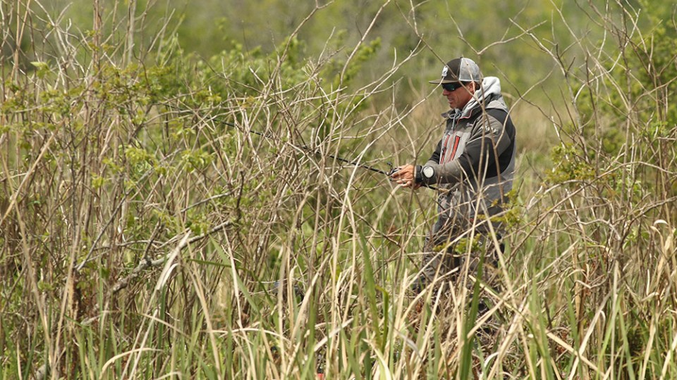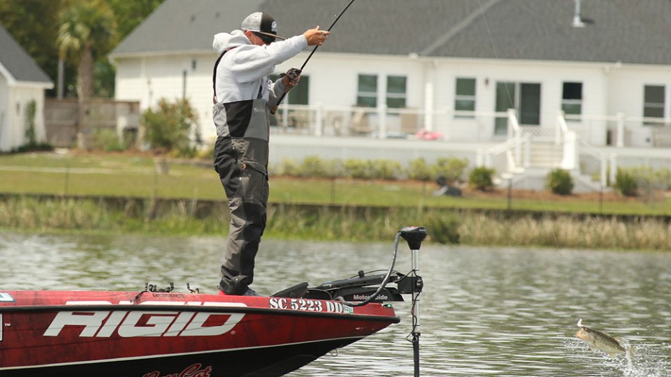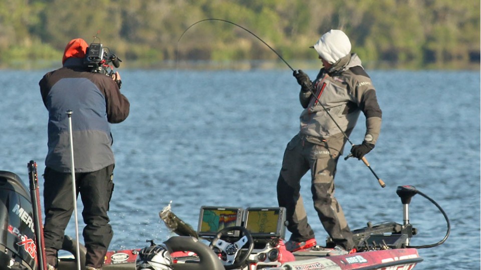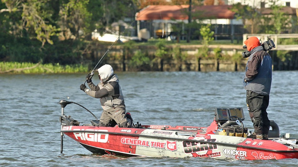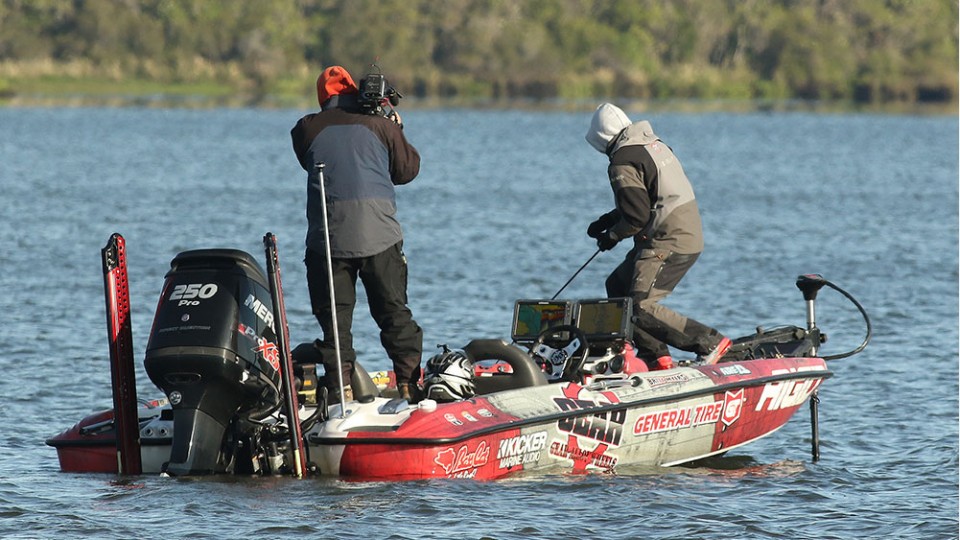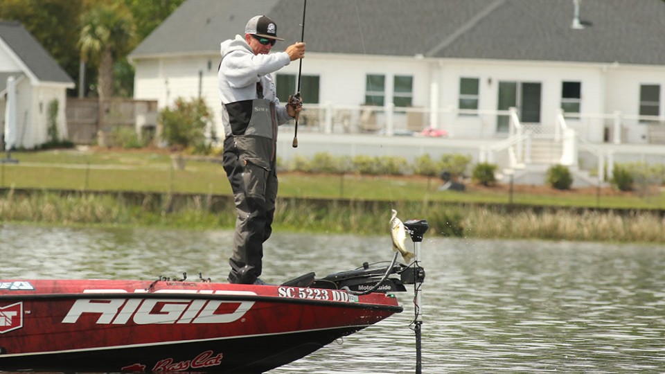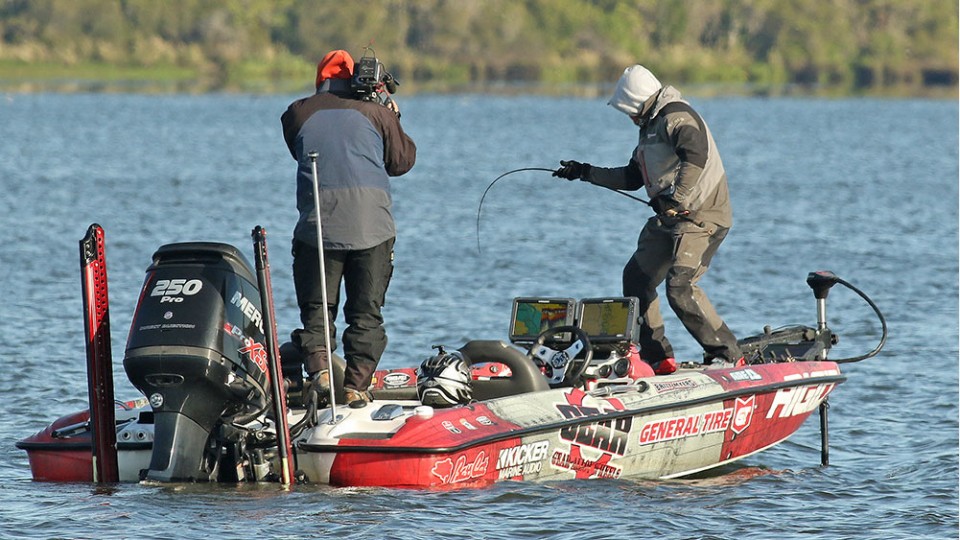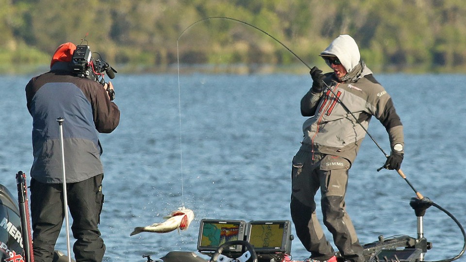 随后,Britt Myers重新返回竞技状态,不断地用Bladed Jig,也就是大家熟悉的Chatterbait,还有Zoom Super Fluke围绕着稻田湖底的倒树和木桩结构作钓。没多长时间,他又钓中第二条称重鱼,并再一次向直播镜头展示一下。