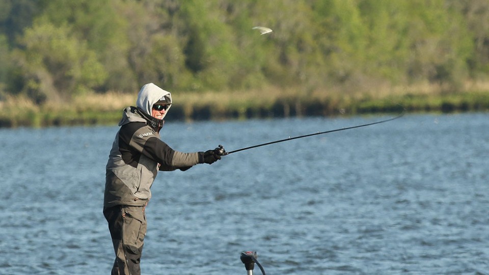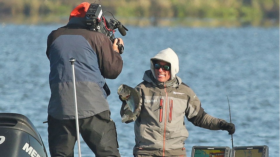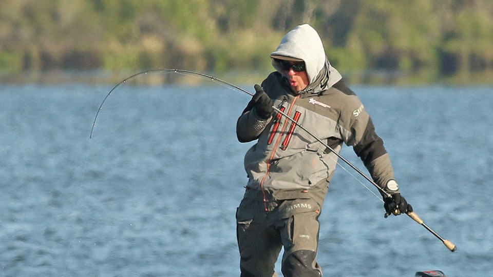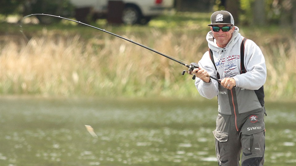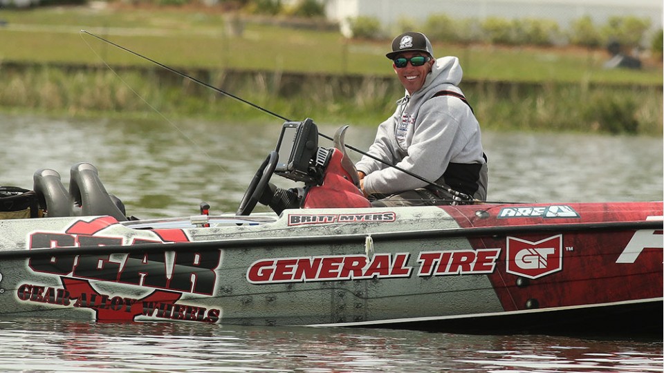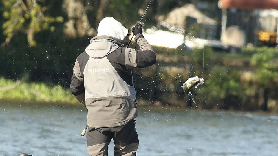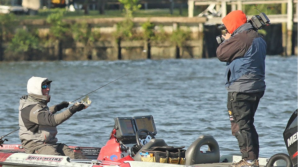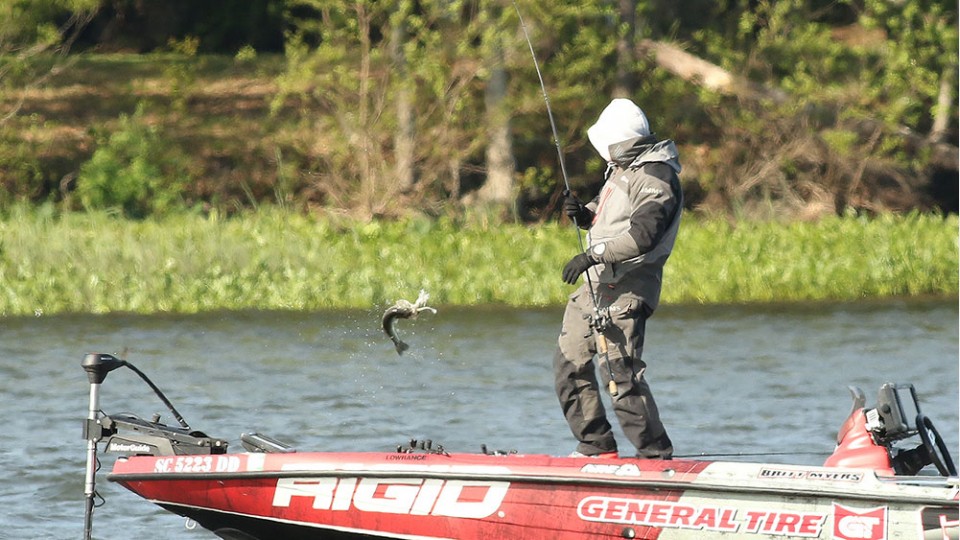 鱼开口了,来不及站起来就打出一杆。接着又打出几杆,Britt Myers便钓上来第三条称重鱼,但这条鱼要比前两条或前三天的鱼获都小很多,但是就算再小,在鱼不开口的决赛日,每一天称重鱼都是至关重要的。