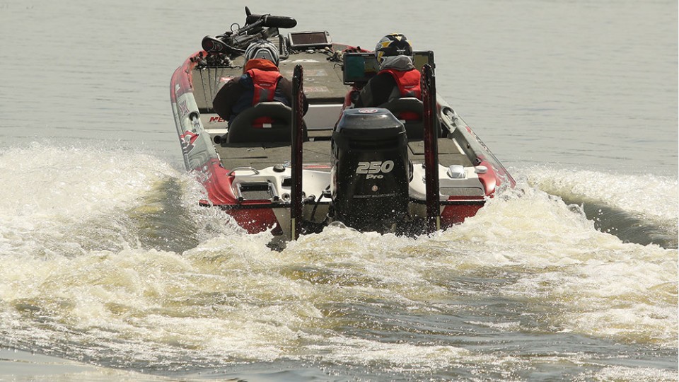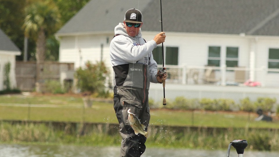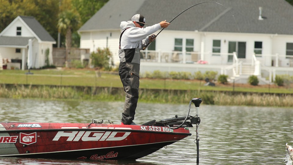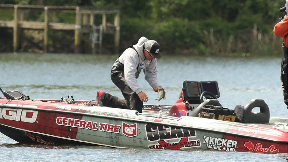 从钓杆的弧度看这应该是条更大的目标鱼。一条3磅多重的鱼获开启了Britt Myers的星期天决赛日,也步入夺冠的正轨。