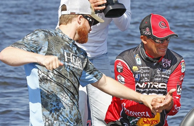 庆幸的是,当时经验丰富的海钓出身的摄影师Garrick Dixon就在附近,他很快就把三角钩从KVD手上拔出来。随后KVD便重返战场,并有如神助般地换了几条鱼获。第二天比赛开始后鱼情并不活跃,但KVD很快就钓到了18磅多的鱼获,随后他换掉两条鱼,最后让自己的鱼获达到20磅11盎司,并以两天50磅整的战绩继续领跑。