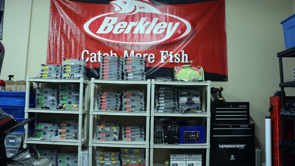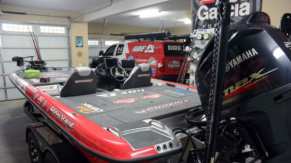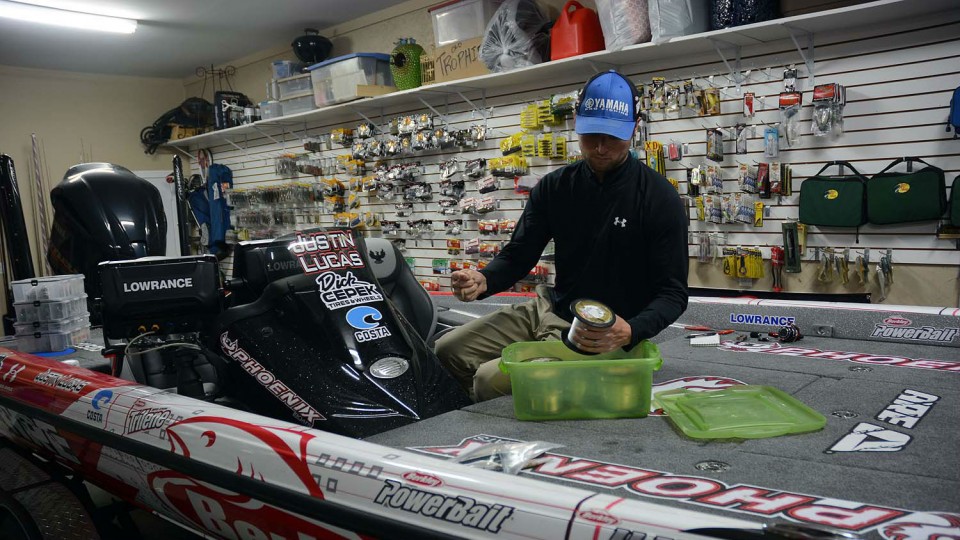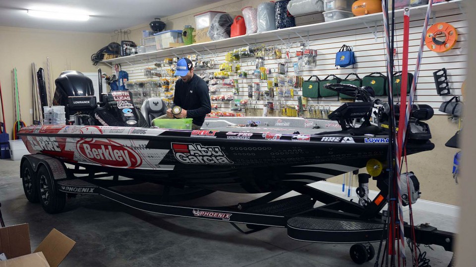 这组照片是在3月初拍摄的,当时Lucas正在为参加一年一度鲈鱼大师经典赛做准备。他的钓鲈艇也是新贴的膜,上面有他的主要赞助商。船库的墙上摆放着与钓比赛相关的用品。