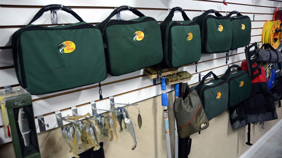 墙上挂的Bass Pro Shop的绿包都是装软饵用的。