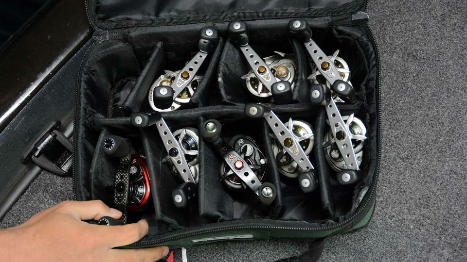 Lucas的所有鱼轮都是Abu Garcia赞助的。他把这些轮子摆放在专用包内,既方便存放,又便于使用。