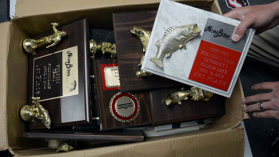不常用的物品都摆放在架子上,其中包括一箱装满了奖杯的纸箱。