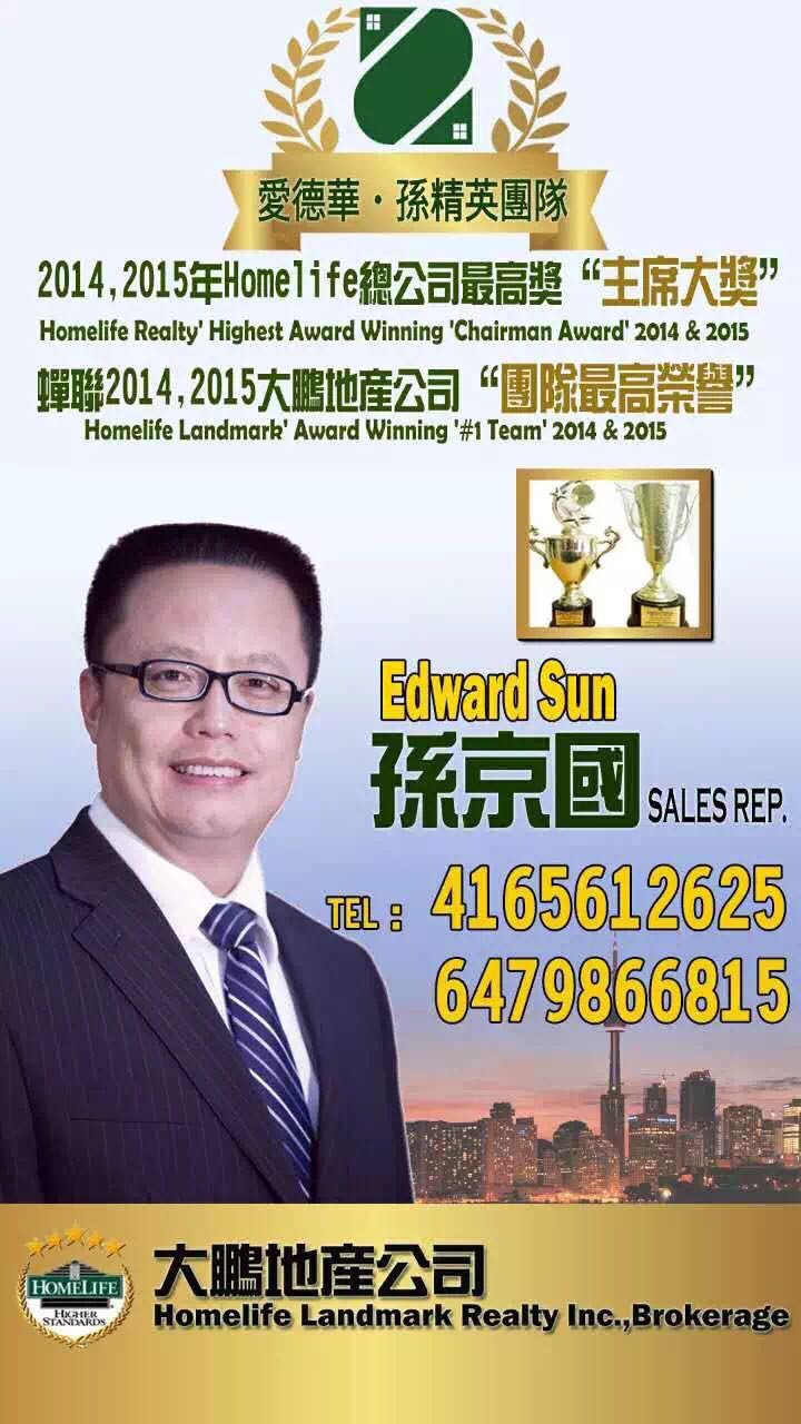 如今的“大嘴”已是多伦多地产界的名人。他和搭档Grace Liu组建的“资深置业首选豪宅名校谈判专业地产经纪团队-爱德华.孙团队(Edward Sun Team)”已连续夺得Homelife总公司年度团队业绩冠军。这些年有关爱德华.孙、孙京国、爱德华.孙团队的报道和介绍,更是经常出现在中文媒体上。其中记者宋苏明在几年前所写下的这段话最令人印象深刻: