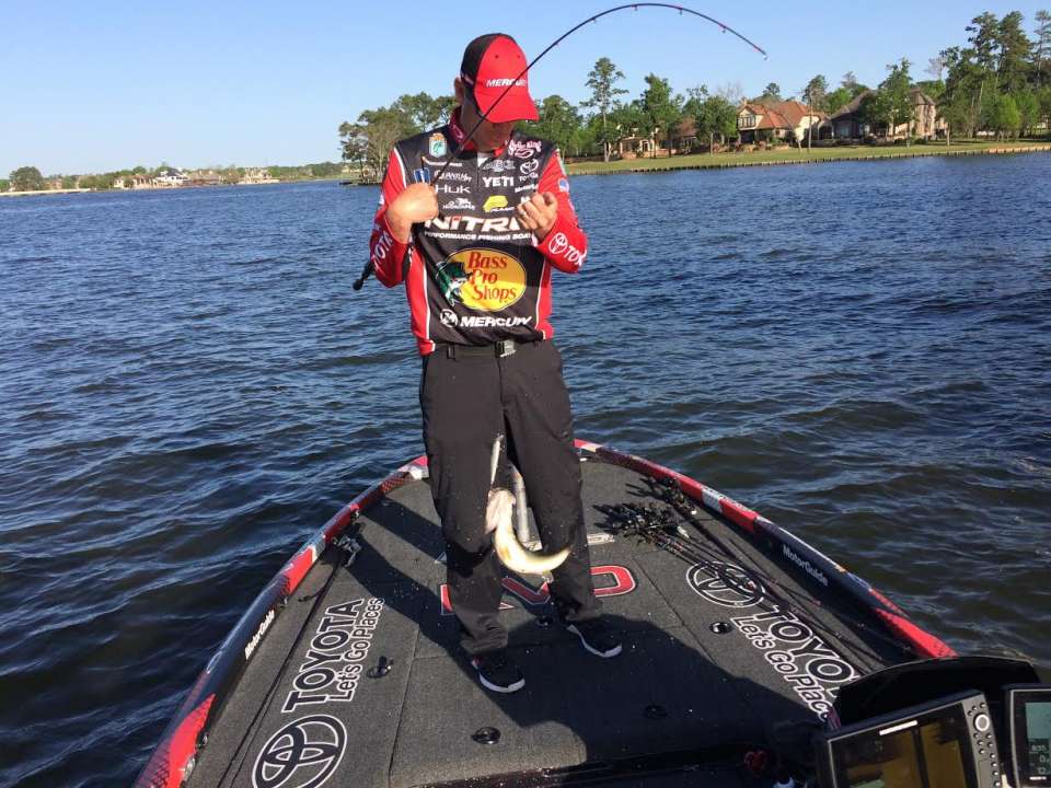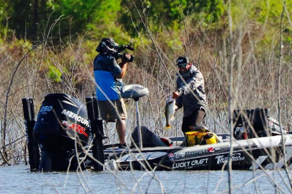 当Edwin Evers领跑了整个一上午,成为现场直播画面的焦点时,第一天名列第一的Brent Ehrler终于在11点左右钓获一条6磅+,成功换掉一条2磅多的鱼获后,Ehrler一举超过“双E”,在BASSTrakk上继续领跑。当时Ehrler选定的作钓水域是一个回水湾,作钓目标是躲藏在浅水区覆盖物下的产卵雌鲈。