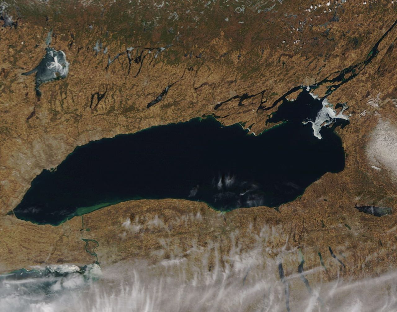 【华钓在线】记者千山报道/近日气温明显回升,多伦多周边水域的积冰已基本化开。不过,NOAA在4月14日下午3时发布的卫星云图显示,靠近安大略省南部的湖,如Scugog、米湖(仍有一些残冰)和BOQ已是Open water;再往北一点的湖,如闪高湖、鲟鱼湖等仍有不少浮冰;不少钓友喜欢的Tri Lake已基本化开,只有鸽子湖北部还有一些残冰。