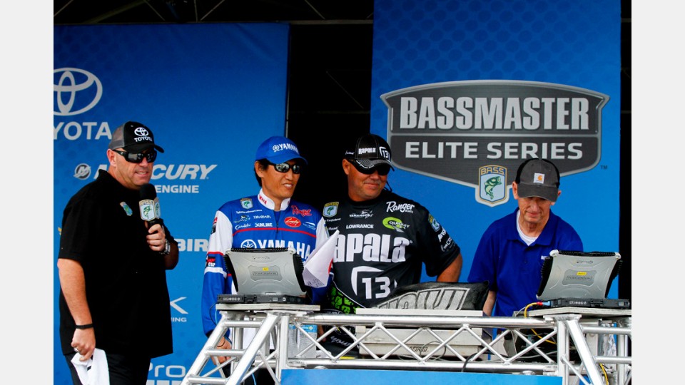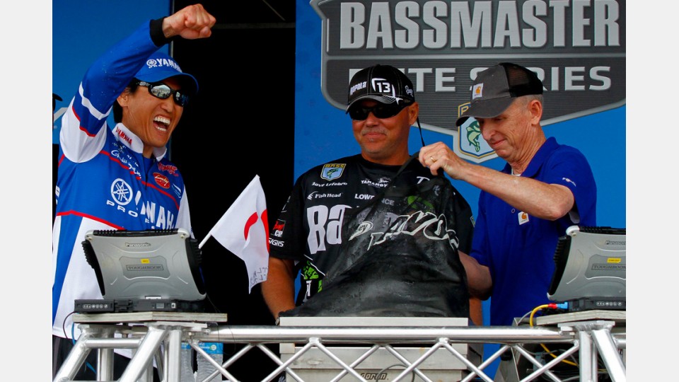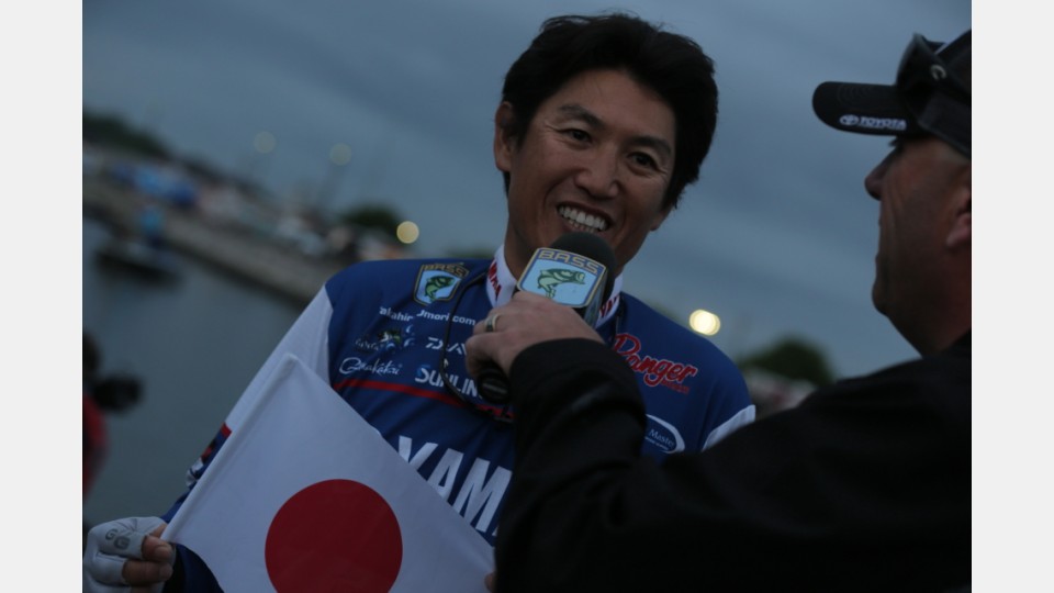 最后一位钓手出场了。当领跑了两天比赛的Dave Lefebre称出16-10磅,总重量为77-3磅时,Takahiro Omori终于在12年后再次赢得了一座冠军奖杯。只见这位夺冠后的日本钓手兴奋地举起那面小国旗,接受亚军Dave Lefebre祝贺。在获奖感言中,这位日本钓手表示,不久前日本又发生了大地震,他在最后一天比赛中把这面日本国旗插在船上,就是想告诉受灾者,他与他们同在。