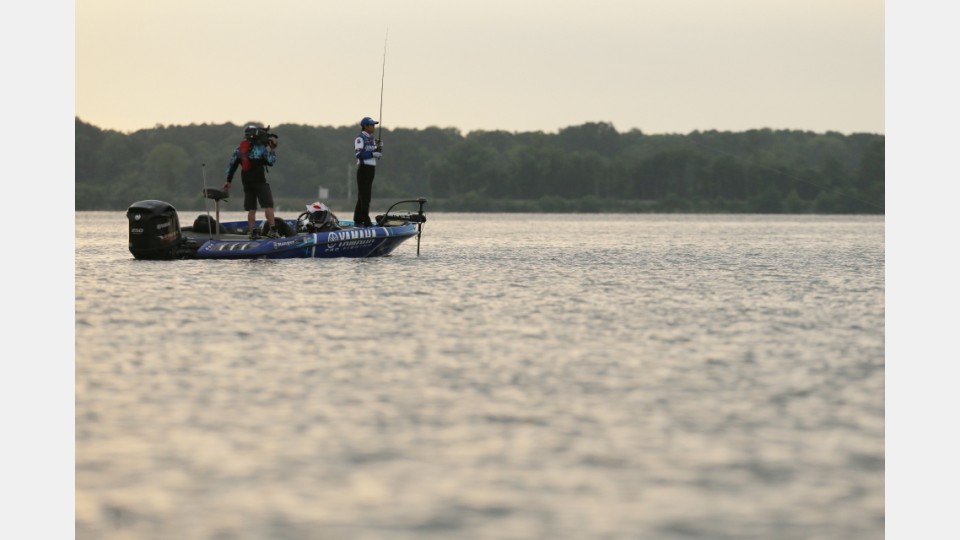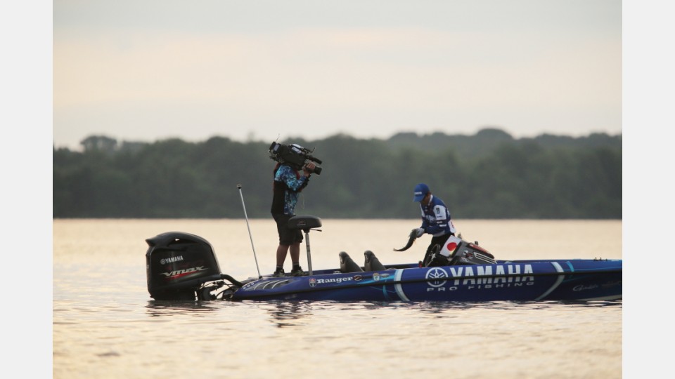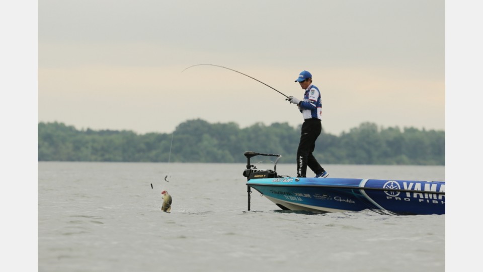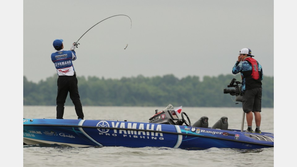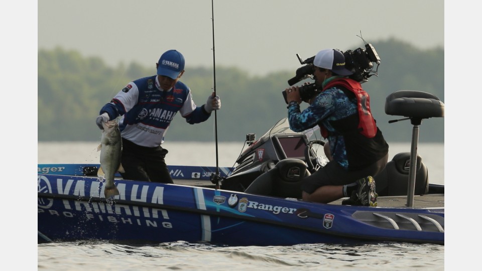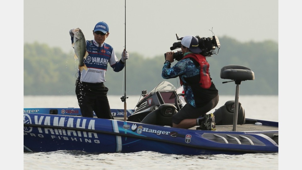 据Takahiro Omori透露,在星期一试钓时,他在这个标点有数个大咬口,但他没有把它们钓上来,而是轻轻抖掉,其中一条至少约在6磅以上。B.A.S.S.官方介绍说,Takahiro Omori的所有鱼获都是早上第一时间钓到的,但随后他又能不断地更换鱼获。他所使用的主打钓饵是水面系walk-the-dog style topwater,还有5英寸的swimbait,间或也会用一下Carolina-rigged worm。