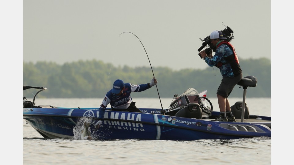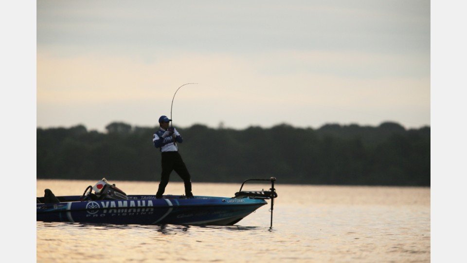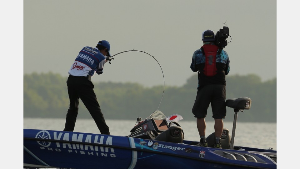 历史就是被不断重复的!尤其是在职业竞技最高水平的鲈鱼大师精英系列赛上更是如此!在第二天比赛中钓获两天赛事的最大鱼袋23-3磅后,第四天比赛一开始,Takahiro Omori便在开赛后的第一时间,抓住产后大鲈极短的开口期,左右开弓,接连中鱼,条条都是四五磅的大物。