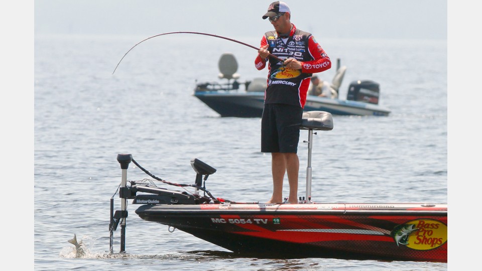 当第一天比赛结束KVD交出29磅5盎司以近5磅的优势遥遥领先时,这位来自密歇根州的超级钓手透露说:“第一天的比赛我是从浅水模式开始的,很快就钓满了很不错的5条鱼获,这给了我足够的信心去钓深水。在试钓时由于大风,我无法按我喜欢的方式去钓深水。所以今天我钓了很多试钓没有钓过的深水水域。”