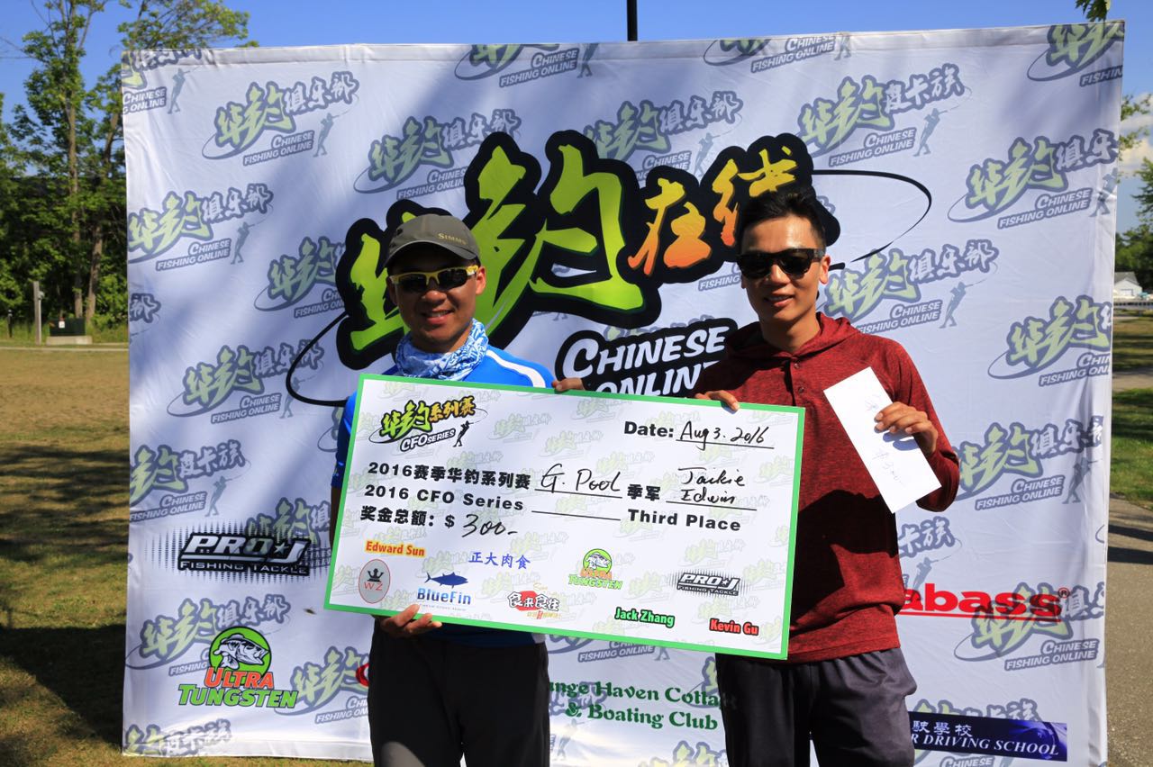 【华钓在线】记者千山报道/8月3日,2016赛季华钓系列赛第三场比赛在多伦多西北部的G Pool落下战幕。在这场华人钓具品牌Ultra Tungsten冠名的大赛中,两位华钓90后钓手--Kelvin Huang和Jeremy Yan以五条称重鱼14磅11盎司再次夺得冠军。获得前三名的船队都交出14磅以上的战绩,而这样的成绩单在G Pool进行的其它大赛中也是非常亮丽的。