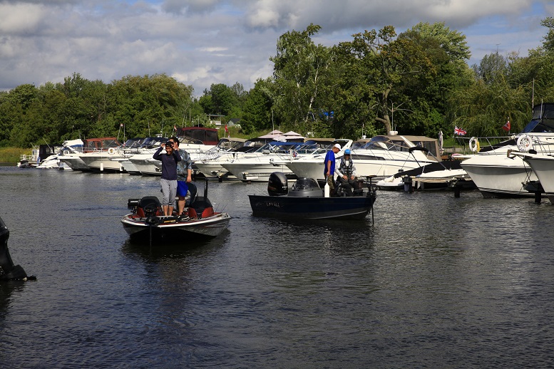 从船行方向看,几个船队一路向南,驶向Goose Bay和河道,目标是大口鲈鱼;另有一多半船队一路向北或向东,应该去寻找大口鲈鱼。还好,淅沥的小雨仅下了20来分钟就停了,很多钓手都在第一时间就钓到了目标鱼。然而相对于几天前的探钓结果,比赛日的鱼情很不活跃,尤其是小口鲈鱼,受低气压的影响,大的小口鲈鱼都不开口了。即使十点过后,阴雨连绵,下了一个多小时,追寻小口鲈鱼的船队都未钓到理想的鱼获。