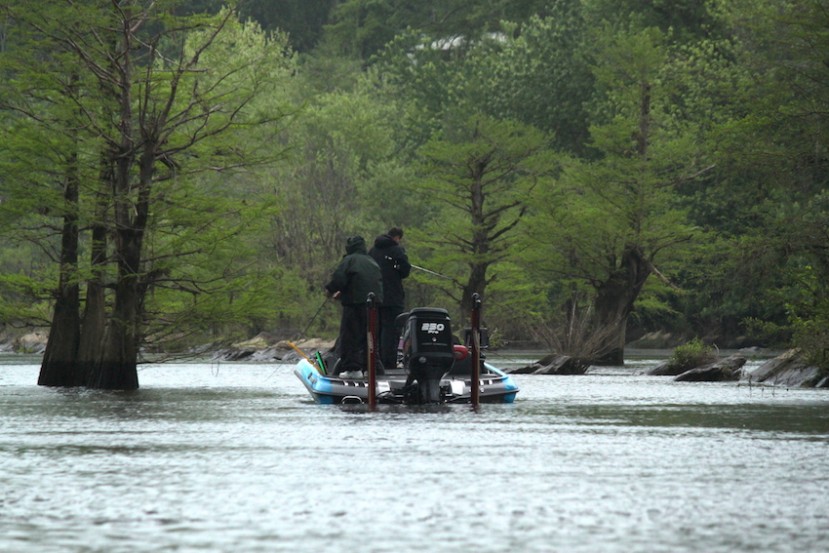 【华钓在线】记者大雷报道/4月16日 鲈鱼大师南部公开赛阿拉巴马河第一天比赛结束。阿拉巴马河是美国典型的河流系统,一直的水流也使目标鱼经常变换位置。这里主要钓的鱼种有斑点鲈鱼和大口鲈鱼,尤其的斑点鲈鱼居多,而且尺寸较大。多数钓手都会带回混合的鱼获。主要寻找的结构有桥墩,石头堆,水中的柏树,近岸边的倒树以及浅水的荷叶等等。主要使用的钓饵有德州钓组塑料软饵(TexasRig worm, creature bait),亮片饵(Spinnerbait, chatter bait)以及浅水硬饵(shallow-running crankbait)。钓手们多数会使用经常转换钓点(Run and Gun)的战术。