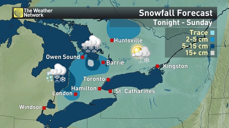 Weather Network的气象学家Doug Gillham说,本地居民最可能见到降雪的机会应该是周六晚间至周日晨间,主要在休伦湖(Lake Huron)和乔治亚湾(Georgian Bay)的东南部地区,而在周日晨间,多伦多的外围地区会有初雪,包括Kitchener-Waterloo, London, Orangeville, Newmarket以及 Barrie。局部地区地面可能会有几厘米的积雪。