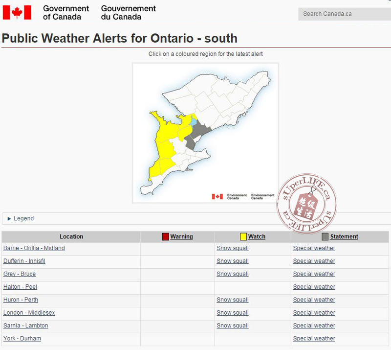 此外,加拿大气象局16日也对安省部分地区发出雪飑警告。本周末气温突降,16日晚安省部分地区很有可能会降雨然后转变为降雪,而且降雪量可能多达15cm。受雪飑影响的地区包括:Barrie, Dufferin, Hanover, Owen Sound, London 和 Strathroy。
