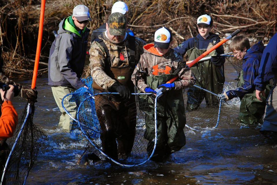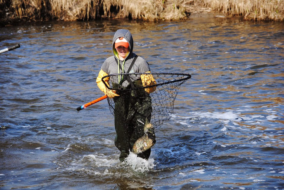鱼集中之后,需要用拦网阻断河道,断了退路,这样一来孩子们就可以在pond里面开心的捞鱼了。由于笔者一直埋头苦干,在拦网搭起之后才可以送一口气看着孩子们一条两条三四条的捞鱼,竟完全没有注意现场岸边已经聚集有过百人,河里穿着waders的大人孩子更是多到将近50人,场面恢弘,有图有真相!