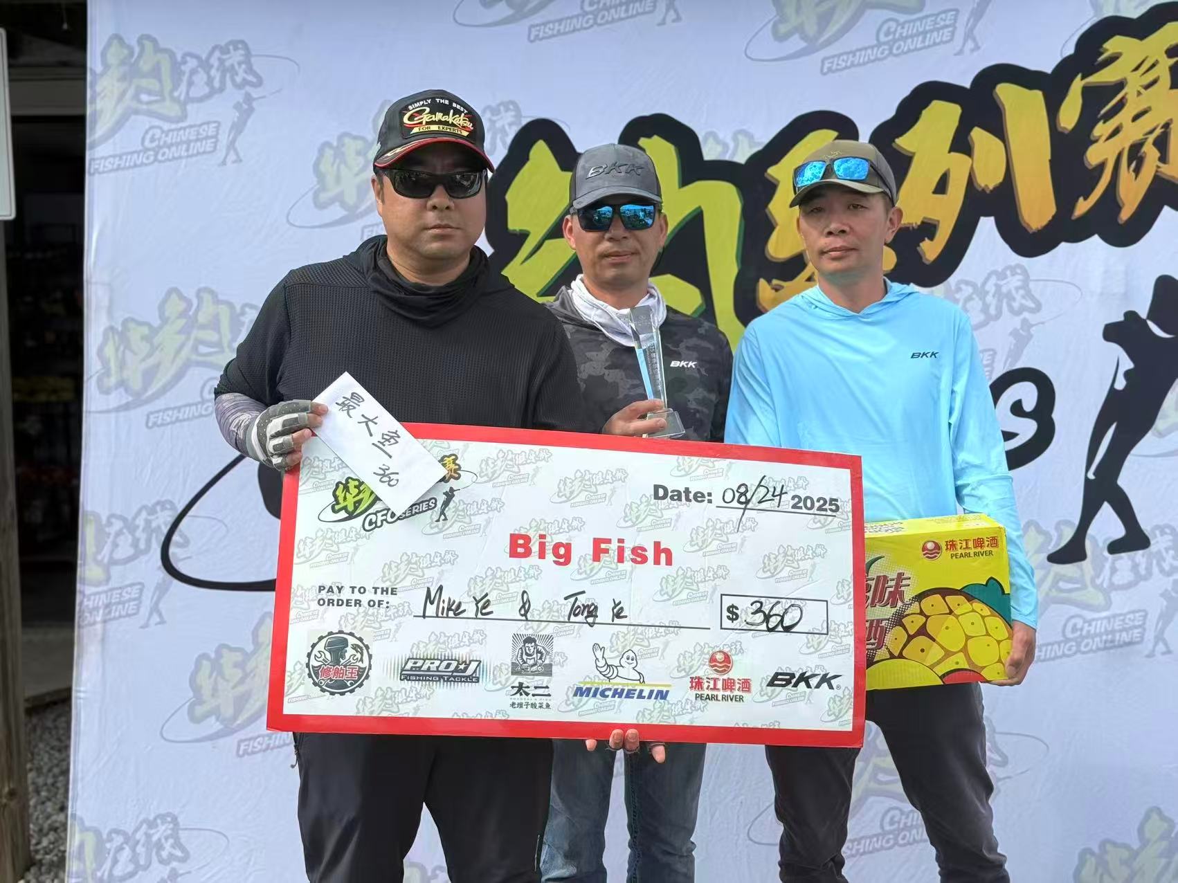 下午的称重环节同样精彩纷呈。MIKE YE与搭档TONG YE交出了5条鱼,重量16.51磅,夺得第二 其中最大一条达5.77磅,成功获得“大鱼奖”,并再次登上领奖台。